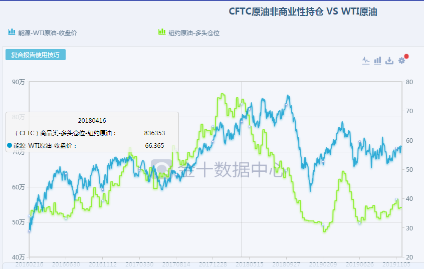 原油非商业性持仓即为投行的投机仓位,从上图中我们可以看到,两组数据呈一定程度的正比例关系,很多人会说这种持仓报告都是有时间上的延迟,但是我想说,这种数据有很大的作用,一般情况下大的机构不会随意更变自己的净持仓,而且机构也是做过大量的研究,所以我们只需要站在巨人的肩膀上,轻轻的踮一下脚尖。