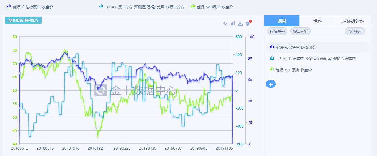 图中统计了2018年6月以来EIA库存数据对应的布伦特原油,WTI原油的收盘价,从图中我们可以看出EIA数据对于原油当天收盘价的影像并不是和想象中的一样完全呈比例关系,有时候是正相关,有时候是负相关,有时候没有相关,所以我一般交易EIA数据时不会完全相信数据,而且有时候因为数据的关系,会给我们更好的价格,记得在2016年8月3日那天,EIA数据强烈利空原油,但是原油跌到39附近就开始强烈拉升,走出了4个月的趋势行情,所以建议大家交易EIA 数据时不能完全相信数据。接下来我们看另一组数据。