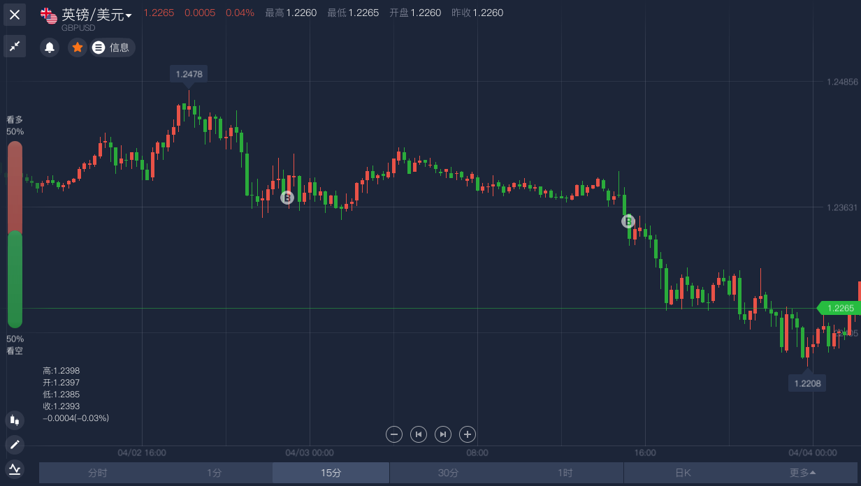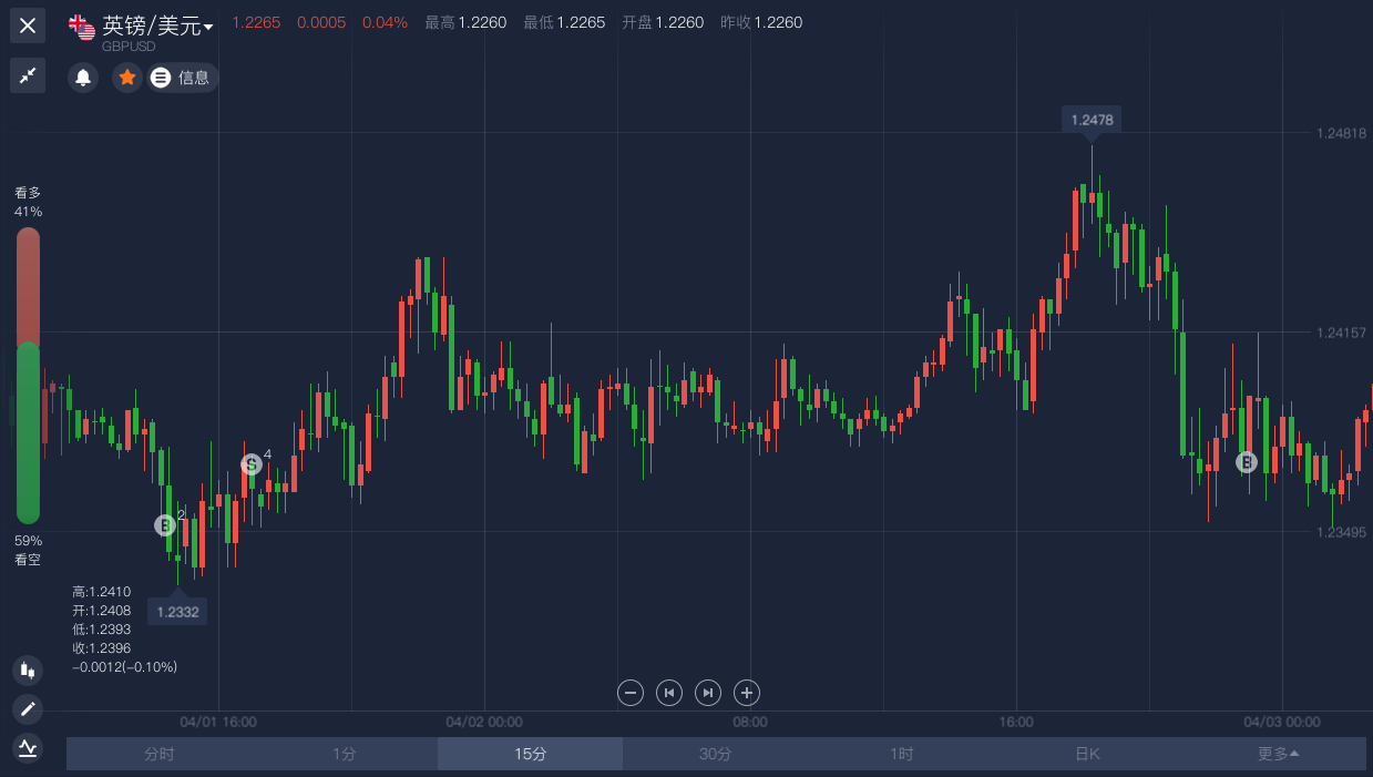第二、三单:连续做空镑美,分别是6手、0.4手。第二单入场原因,现在看15分钟K线图,肯定是会觉得我是个傻子对不对,哈哈,当时基本面是不利好美元的,TC策略也是看空镑美,入场之后不久,就开始亏损, 短幅上涨之后我就想加一单去补亏损,结果价格持续上涨,到了晚上价格还是涨,于是持仓过夜。第二天下午,经历了亏损一千浮动的金额,心有点虚,在0.4手空单盈亏接近0的时候选择了平仓,亏损16美金。0.6手的镑美空单还再持多了一天的单,4月3日下午,一个短线下挫的机会,选择空仓,盈利18美元。