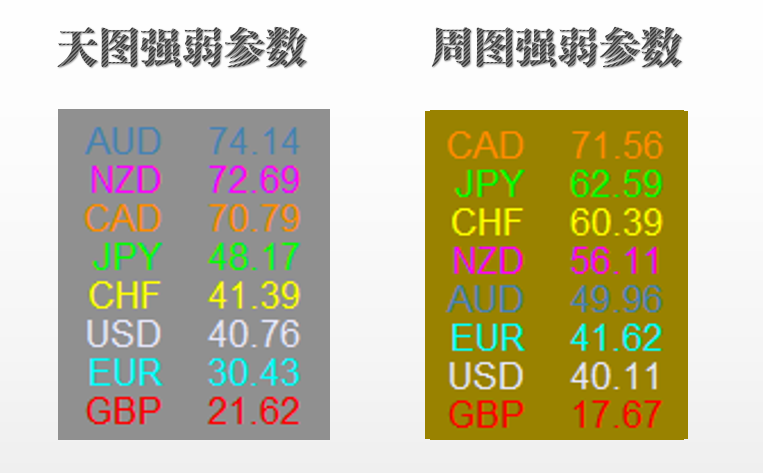 截止至今天中午12点的强弱指数显示,现在最弱的就是英镑; 最强的有澳元、新西兰元、和加元,三者的指数相差无几(如下图)。