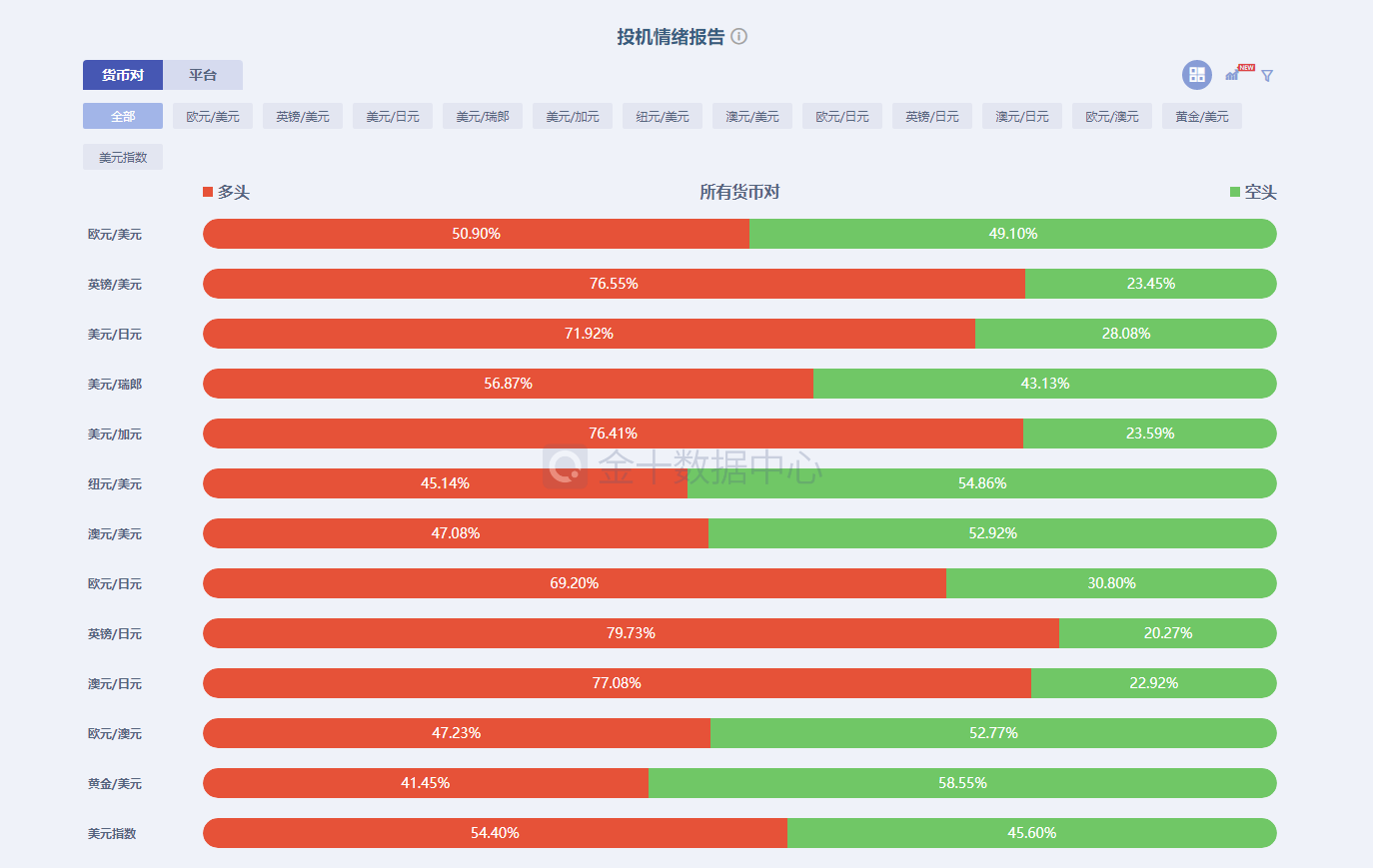 下图金十数据中心的投资情绪报告显示,截止至今天下午1点整,澳元和新西兰元一般投资者中,多空双方力量相对来说比较均衡,没有明确的方向指示。而加元则做空的一般投资者占到76.41%。大家都知道这是一个反向指标,当一个方向的交易者超过60%之后,数值越大,反向操作的胜率就越高。所以加元的强势属性被投资情绪报告数据证实了。