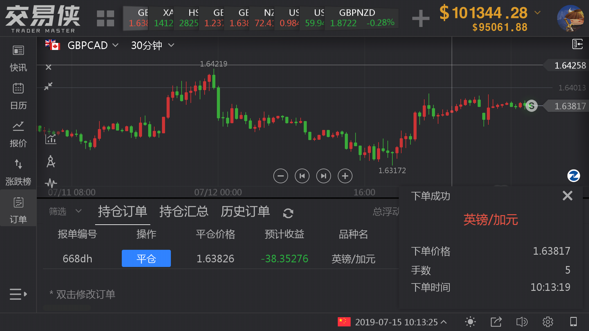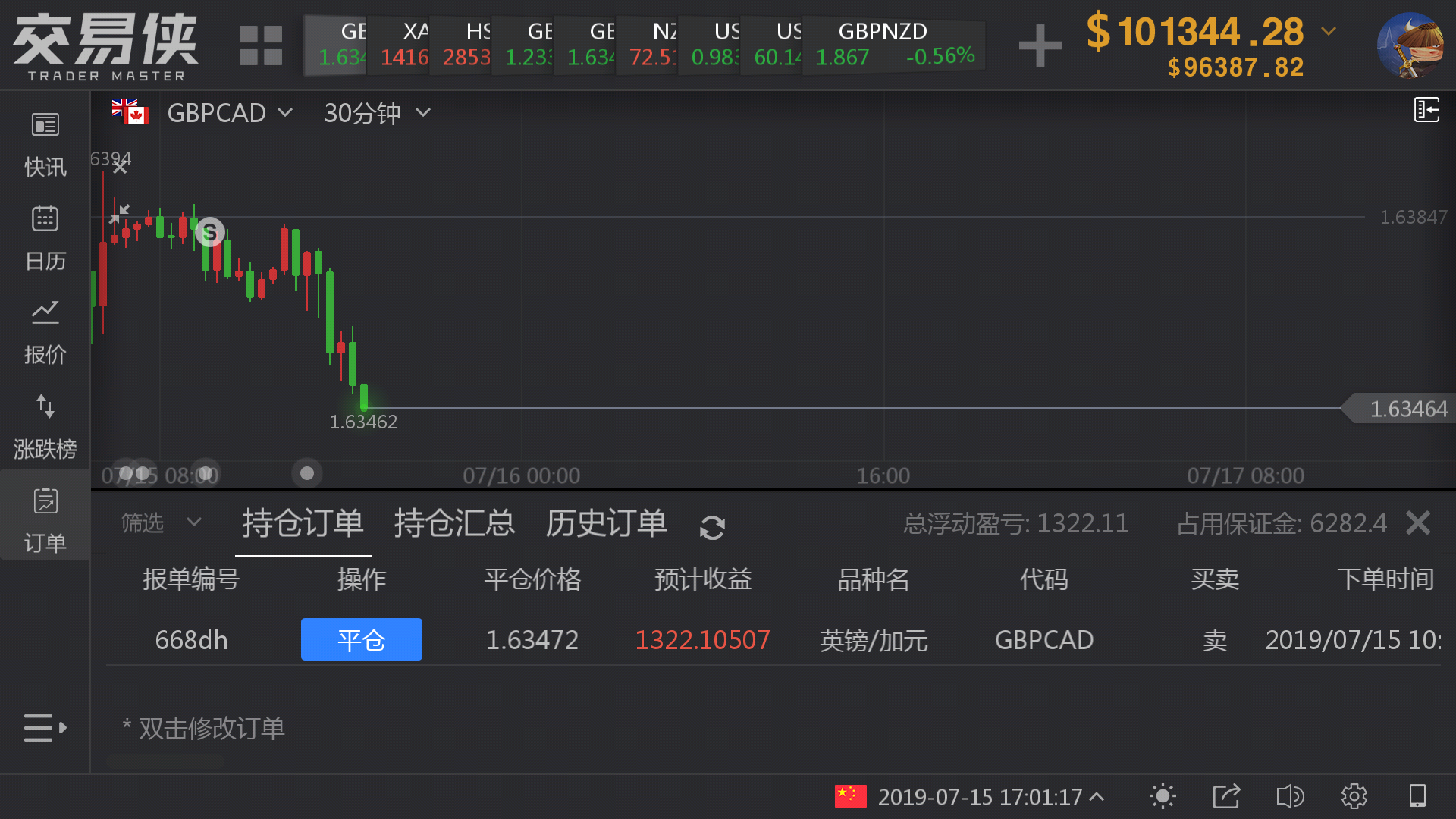 我的实盘上周持有两张镑加空单,为了示范,我,在金十数据的交易侠中模拟做空了5手镑加。