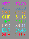 大洋洲的货币是终于占到了最强的地位。但是在右图的周线图显示它还不是最强的。最弱的还是英镑。这样来说今天英镑对加元,对澳元和新西兰元都可以作为做空的交易选项。