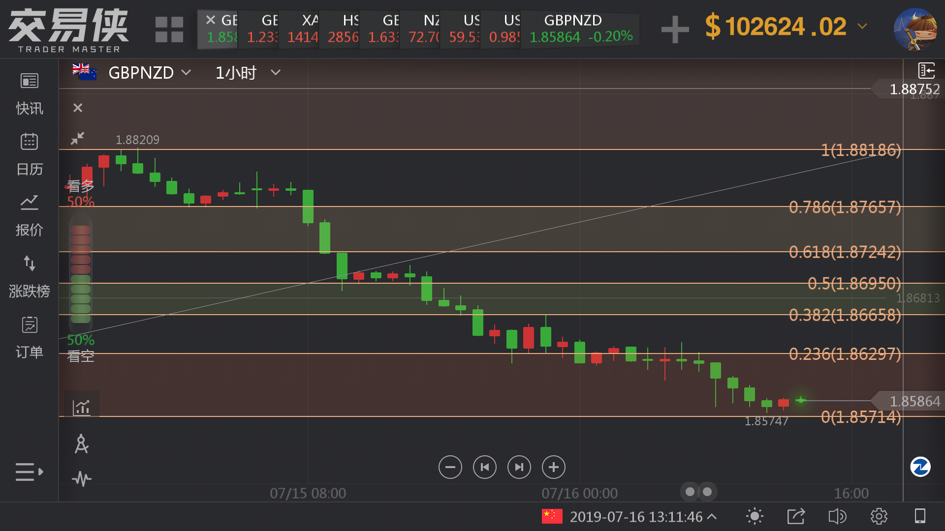 镑纽昨天保持单边下跌。我给昨天的主要波幅做了一个黄金分割分析。计划在38.2%和50%这两个位置做空单。