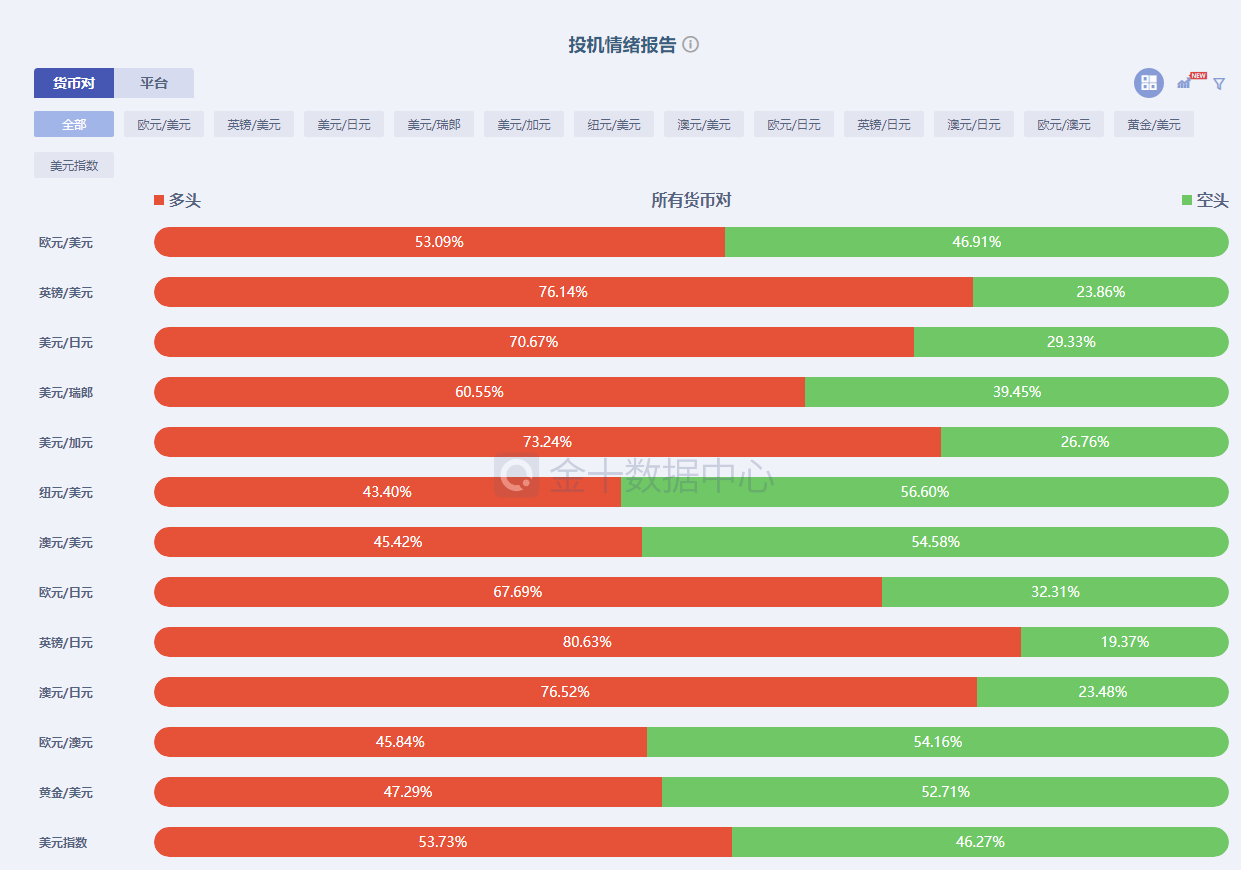 新西兰元呢,稍显纠结,多空双方的力量,相对来讲相差不太大。但相对于前两天的报告来说,做空纽元的投资者小幅增加,以投资情绪报告原理来说,纽元微弱倾向于继续上涨,但情绪报告并没有清晰的方向。