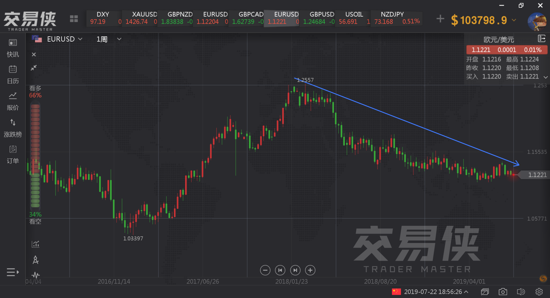 做多欧元的投资者超过66%,显示欧元有进一步下跌的可能。