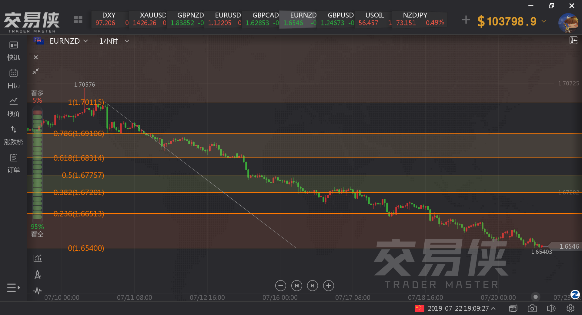 综上所述今日做多新西兰元,做空欧元。也就是做空欧纽。我们在行情小时图明显的下跌趋势给一个黄金分割,至少在23.6%开始建立空单。
