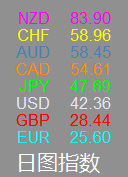 新西兰元一骑绝尘,在日线图上已成为唯一一个超过80的货币,同时在周线图上小幅超过加元成为最强货币。所以今日做多货币首选新西兰元。