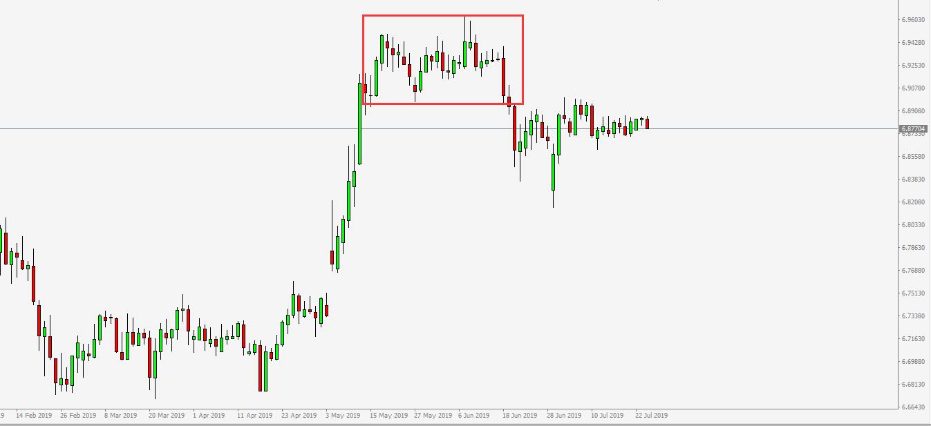 上图是近期美元兑人民币的日线图,红框内的低点在9.8950附近,高点在6.9650附近,振幅大约700点。那可以猜测到在这两个位置附近应该有大型期权镇守住,当价格下跌到9.8950,这个期权的主人就要在现货市场或者期货市场大幅买入把价格推高;而到达6.9650附近,这个期权的主人就要通过现货市场或者期货市场大幅卖出把价格推下去。这些期权的操作种类除了欧式期权、美式期权,还有knockout option、double no touch等等也就是我们说的DNT之类,而在图表的表现形式都是上述那样,期权详细一点的内容之后可以之后几篇文章讲讲。