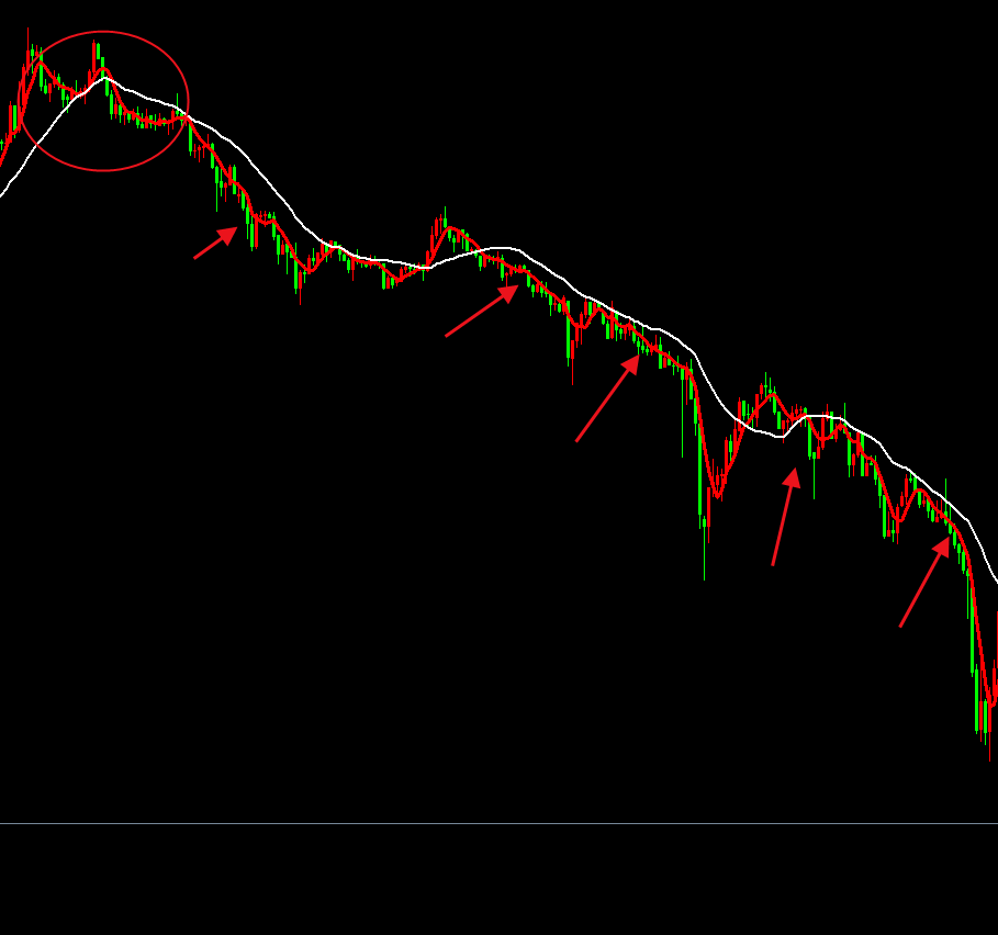 图中的圆圈处是头部交易的入场处,而中部交易在箭头位置皆是可以入场的,这种交易模式最为注重的是行情的方向,而不是寻找极限的位置,所以如果你是一个对于交易的方向判断较为准确的交易者,其实中部交易有更大的优势。确定方向,给一个大一些的止损,等待行情的发展就可以了,而不用去时时刻刻盯盘,时刻去寻找“最好的位置”。