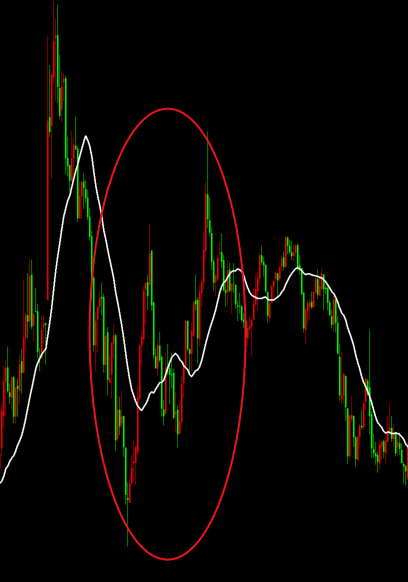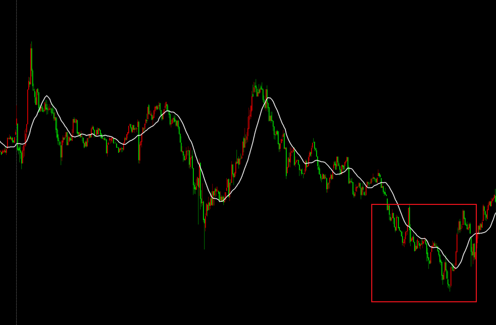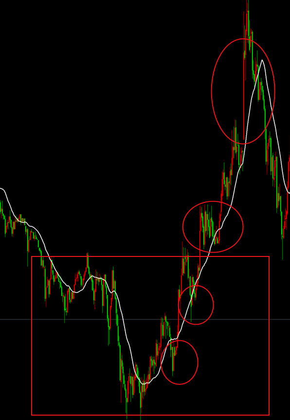 市场继续向后发展,进入美盘时间段之后,行情开始了反弹,而在突破方框区域后,图中时间级别的行情确认了反弹转为了上升的行情,而这里立马就给出了第三个圆圈处的入场机会。可以看的非常的明显,第一个圆圈,第二个圆圈处都是突破二十日线之后拉升,而第三个圆圈处是相同的。当然,第一个和第二个圆圈处并不是机会,这时候行情还没有完全确认反转,而第三个就是非常好的入场机会了,我个人也在这里抓住了一波行情。