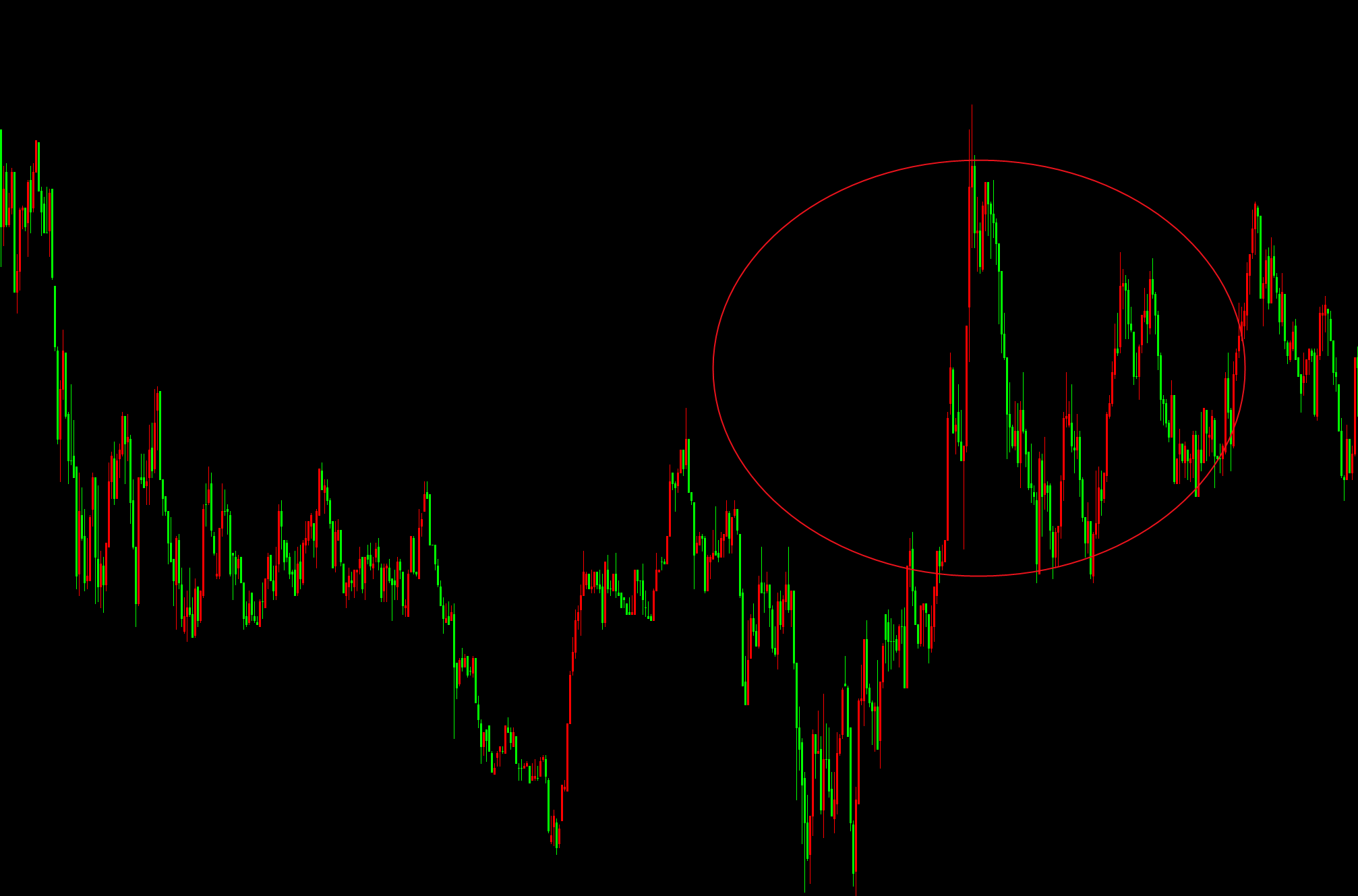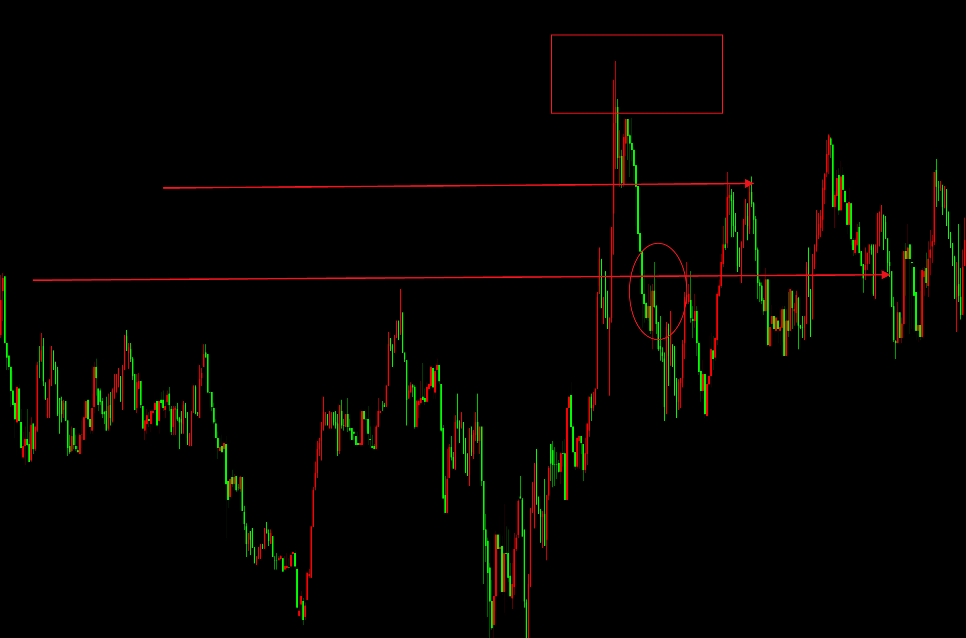 如图,价格在圆圈处突破了下降趋势中的前高,可之后的行情却走入了震荡之中。