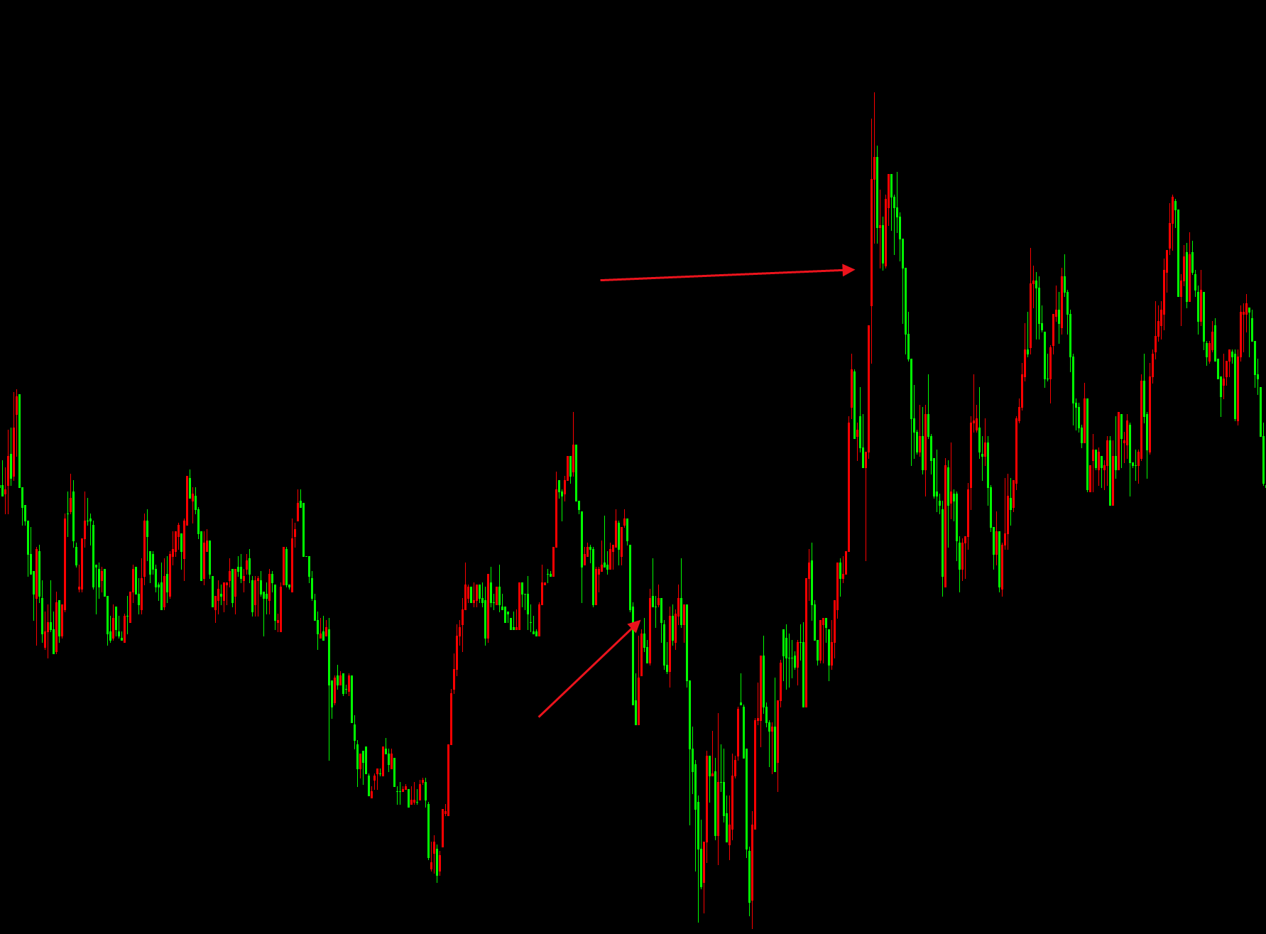 而我的改进目标并不是希望能在这样的行情中盈利,而是在这样的行情中做进去的空单,希望能够去减少掉它的损失。比如在上图圆圈之前的高点入场做的空单,在圆圈处如果向上突破了,就会选择平仓止损。这种止损是我希望能够规避掉,并且能够有一些微薄的利润的。