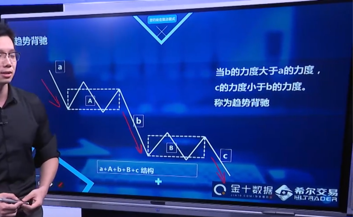 趋势背驰指的是逼的力度大于c的力度,c的力度小于b的力度。