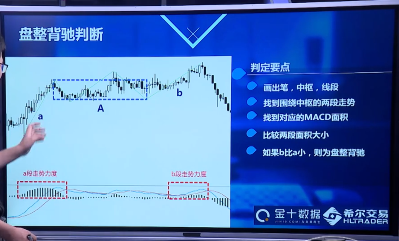 盘整背驰的判断,我们需要通过以下几个要点,第一话,画出笔,中枢,线段,第二,找出围绕中枢的两段走势,第三,找到对应的MACD面积,第四,比较两段面积的大小。如果b比a小,则为盘整背驰。