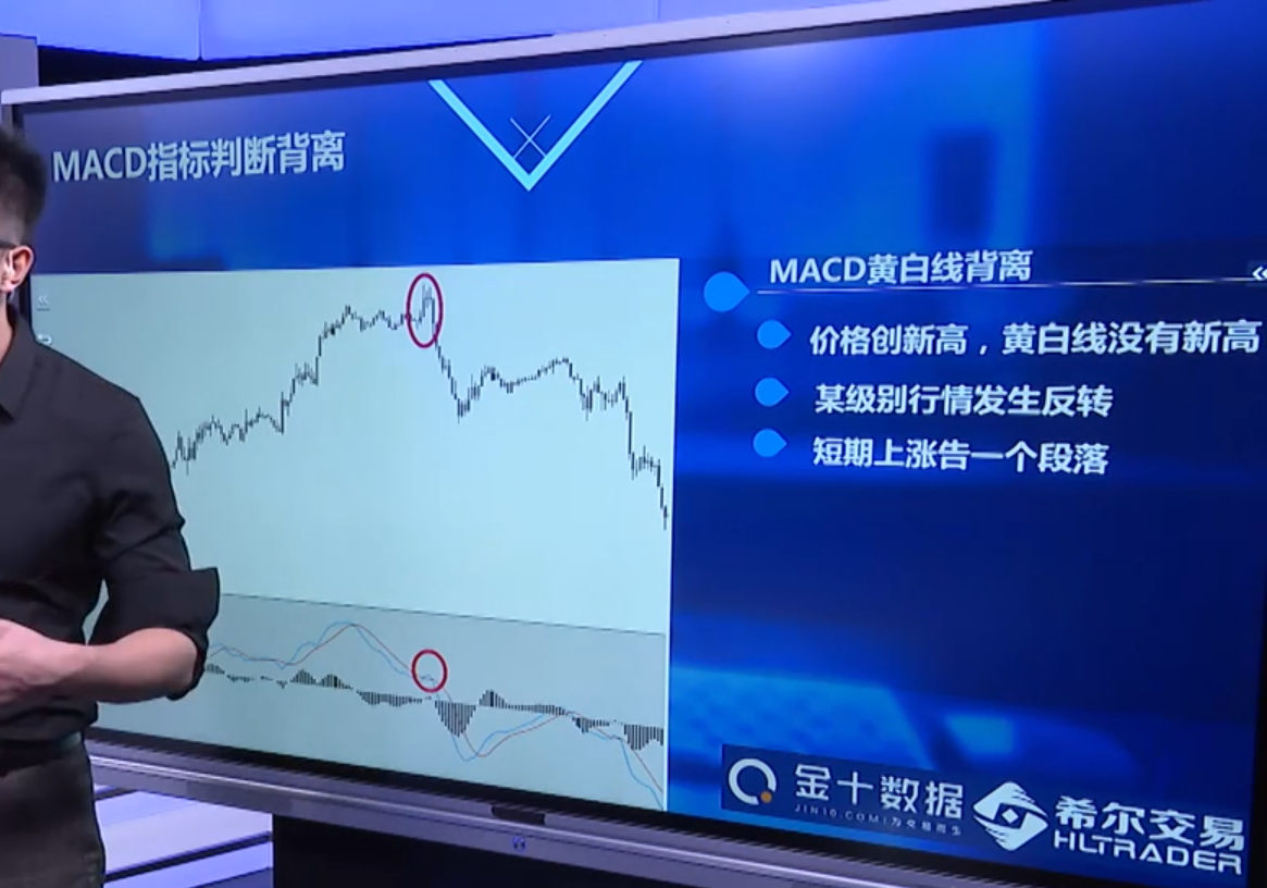 MACD黄白线背离的标准,第一,价格创新高,黄白线没有新高,第二,某级别行情发生反转,第三,短期上涨告一个段落。