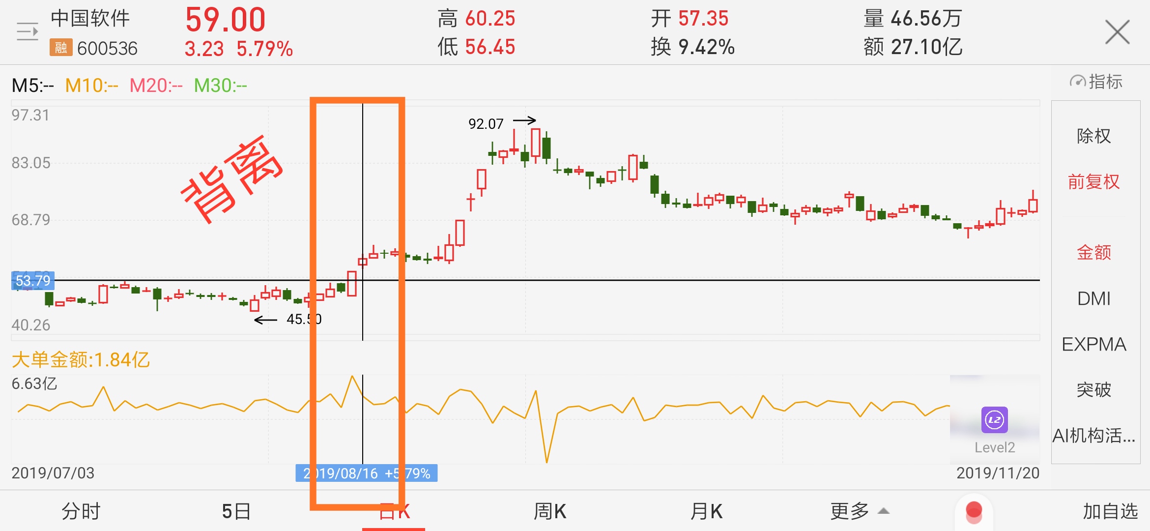 在2019年8月6日左右,中国软件蜡烛图稳步上升,局势较好,我选择买入,但随即被套进行的一波平走和一点点下跌。现在我运用MACD技术进行分析,发现他的MACD指标与蜡烛图进行了背离。8月16日蜡烛图向上走,但它的MACD指标下降。构成了一个显著的背离现象。从而间接地说明了牛方的力量已经有所衰弱,熊方有可能获得的主导权,所以我应该采取保守的谨慎政策。对此背离的现象加以防范。从而做出更加正确的决策。