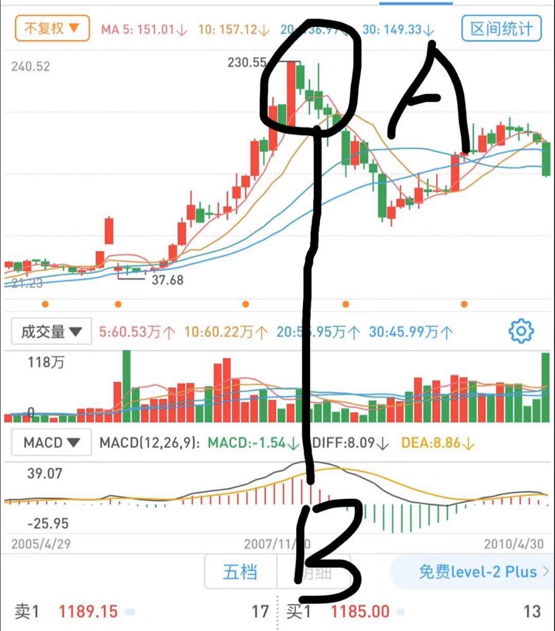 如上图所示,在a段价格上涨且MACD指标较大,力度较大;A处时为中枢,快慢线缠绵;在b时价格上涨,MACD的活跃程度没有a处高,于是经过在B段时的快慢线缠绵时,在c一路下滑。可以从a、b出的强度可以判断第二个中枢之后的走势。如果b大与a时则结果正好相反,它会在经过第二个中枢之后上涨,至于涨多少还得看行情。