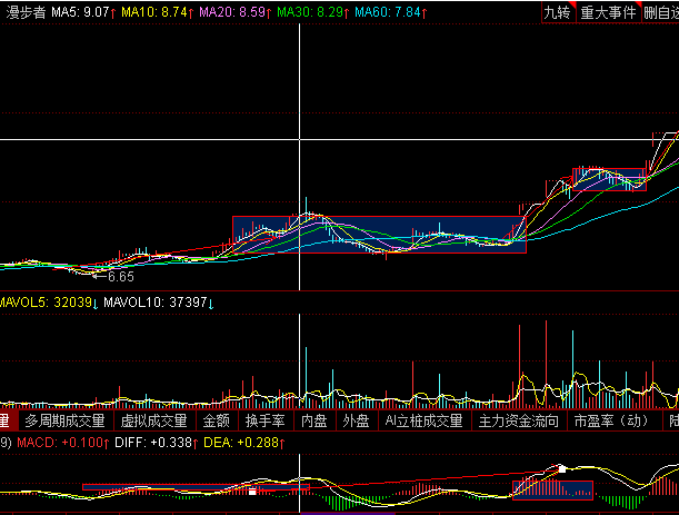 按照计划,用30分钟分析同期的漫步者这只标的,不难发现,也是一个同样的上升段加中枢加上升段的上升趋势形态,而相对应的macd指标,红绿柱面积一直扩大并未发现背驰或者背离现象,因此,在b段上升段结束后进入B中枢突破就可以介入,后续又是一波上升段。