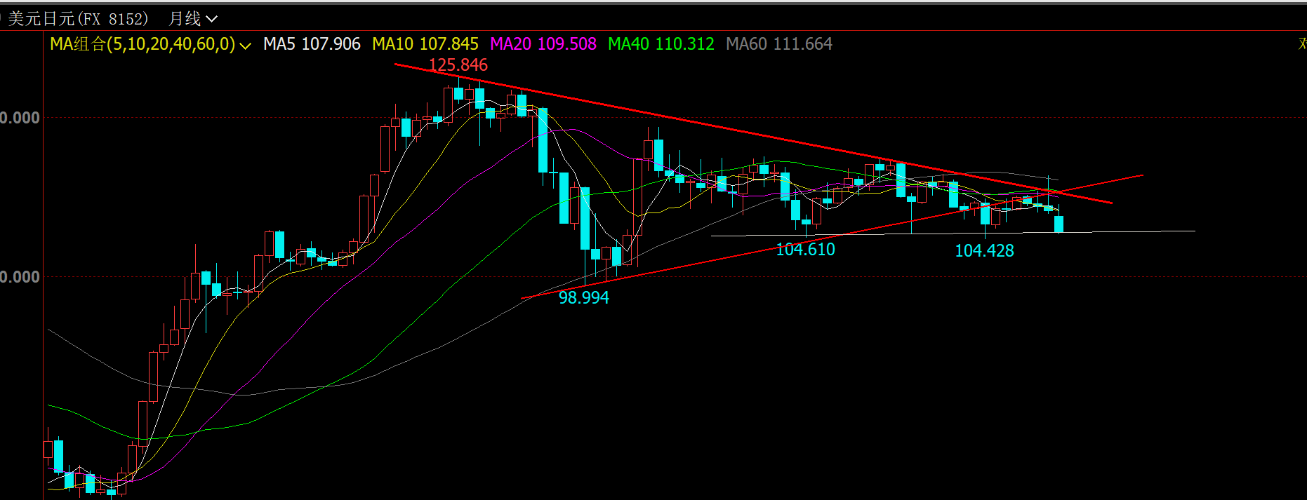 美日月线就是一个非常好的例子,同时包含了收敛形态趋势线和普通的趋势线。