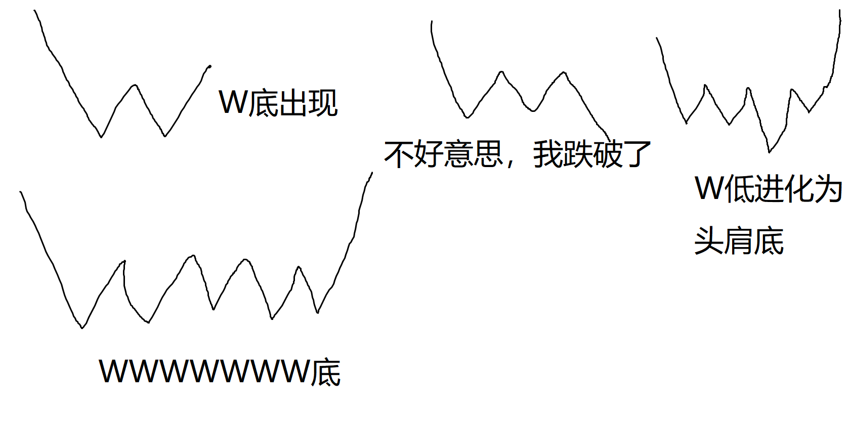 单独拿W和M出来作为反转形态实在没必要。看回上面说的,W和M本质上就是只有2个点的趋势线来作为支撑压力而已。