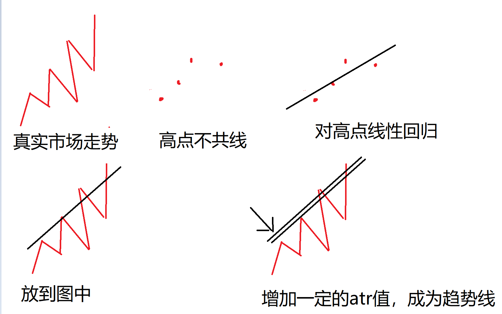 我们把趋势线看成对各个高低点的线性回归。只不过当各个高低点的共线性很强时,就不用算他们的线性回归了,直接连起来就是了。