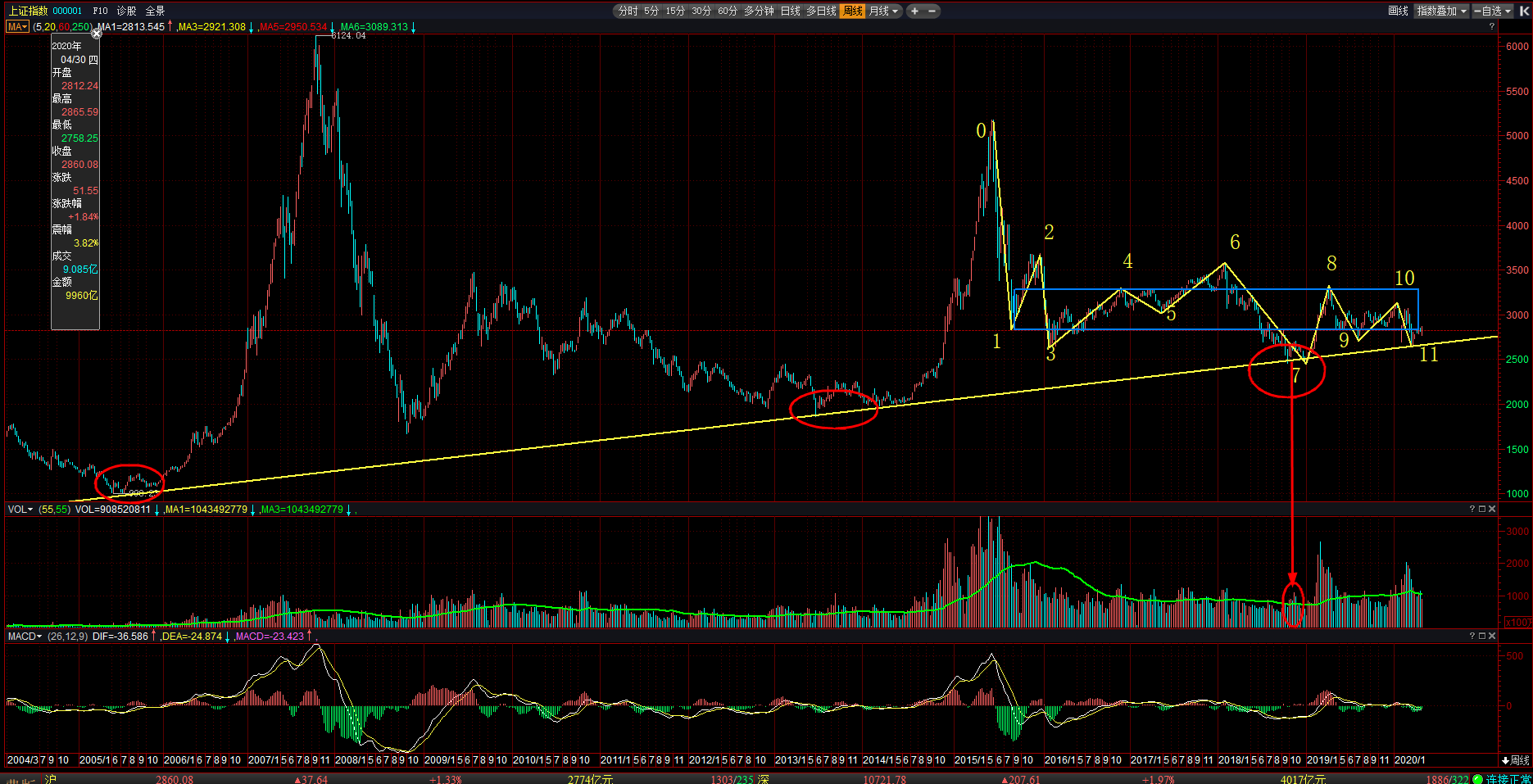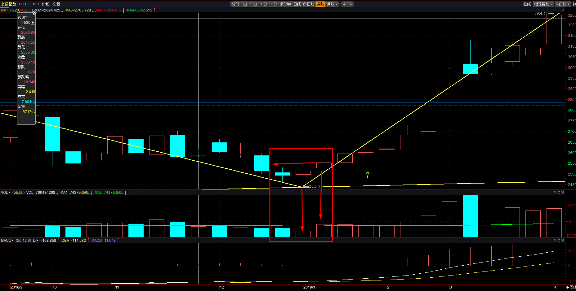下面我们结合案例来看一下趋势反转信号的实战应用,如上图所示,这是我们A股上证指数的周线图,图中黄色的支撑线是连接的998点和1849点的连线,这条连线刚好与图中67周线一笔的下跌相交于2440点左右,说明2440点这里有支撑。再来看结构,从0号点5178点开始,到7号点为止,上证指数走了一个完整的周线一中枢背驰的结构,67与01相比明显背驰;同时7号点底分型对应的下方也有明显放量的迹象。