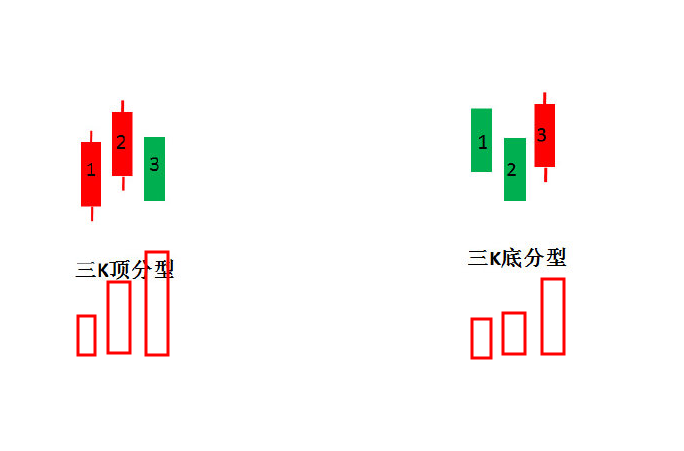 典型的分型结构就是把力度和成交量给加了进去,如上图所示,图1是顶分型,图2是底分型。典型的分型就是看第3根k线能够吃掉第1根k线涨幅度的多少?如果分型中的第3根k线把第1根k线的涨幅全部吃掉,加上第二三根K线放量的话,这样的分型就属于典型的顶分型,形成反转的概率就很高。同理,图二底分型中,如果第3根k线在涨幅上能够把分型形中的第1根k线全部吃掉,而且第二三k线还放量的话,最好是倍量,那么这样的分型就叫做典型的底分型。如我们常说的早晨之星,黄昏之星的结构就是典型的分型结构。